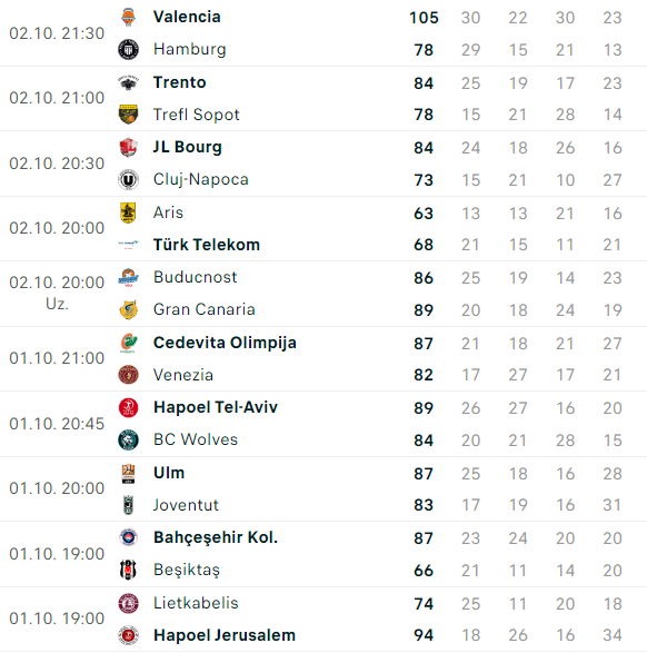 - Caleb Homesley (Gran Canaria): 23 sayı (4-8 üçlük), 4 ribaund, 2 asist, 26 vp